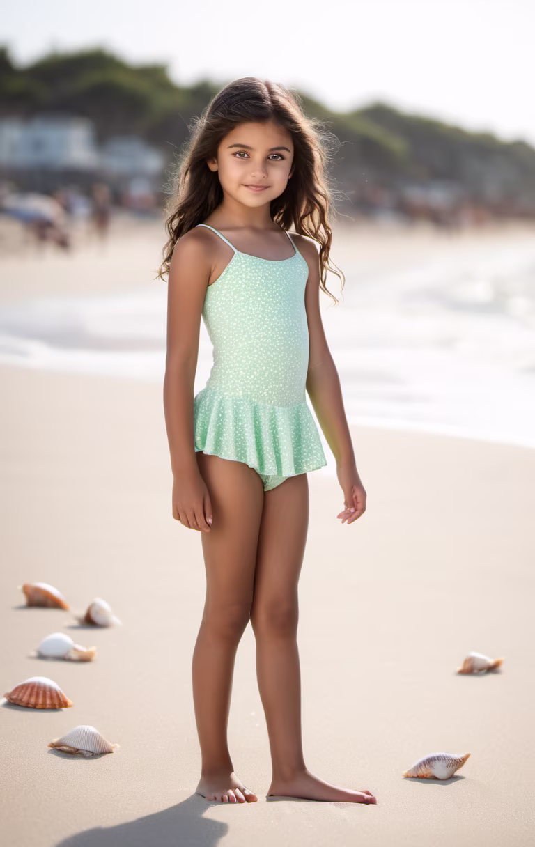 Prompt: A photo of a teenage Indian girl wearing a low-rise two pieced microkini. She has delicate petite features. She is Indian. She is wearing a two-piece low-rise microkini. She is very small-figured. Full body photo. She has a youthful, innocent, slightly smiling expression. She has auburn highlights in her long black hair. She has stunning gray-green eyes and her skin is not extremely dark. She has bare legs and bare feet. natural light. She is collecting small seashells on the beach.