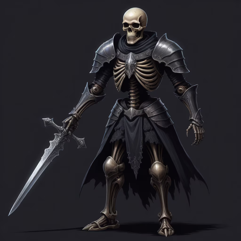 Prompt: skeleton knight, sprite, dark fantasy, turn based game, semi realistic, fully black background, one sprite only, correct eyes, correct anatomy, full body not cut off