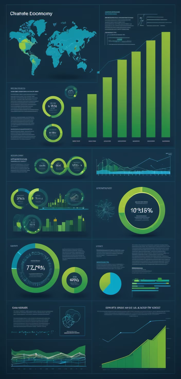 Prompt: create a visualization infographic to show opportunities and challenges of a low-carbon economy, data visualization, charts, graphs, high contrast, blue and green, light background