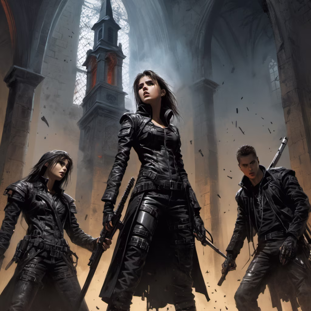 Prompt: Hostage-taking in the bell tower of a church. Teenagers are covered in sticks of explosives, looking terrified, prostrate. Cyberpunk atmosphere. (artist: Luis Royo) (artist: Chris Achilleos)