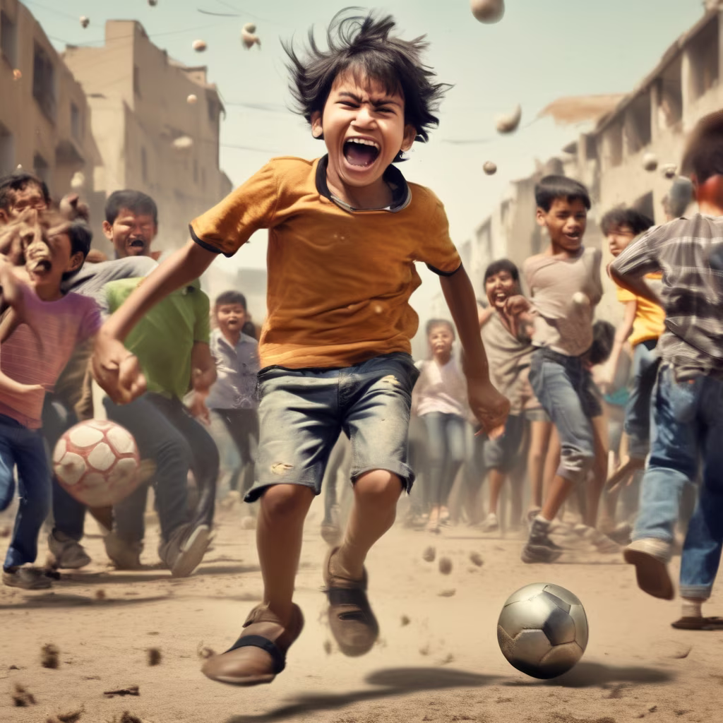 Prompt: a kid steeling a ball carry it by his waist and running away in joy, the boy laughing maniacally, while there are many other kids are chasing him down a windy road, ultra realistic skin, ultra realistic face,