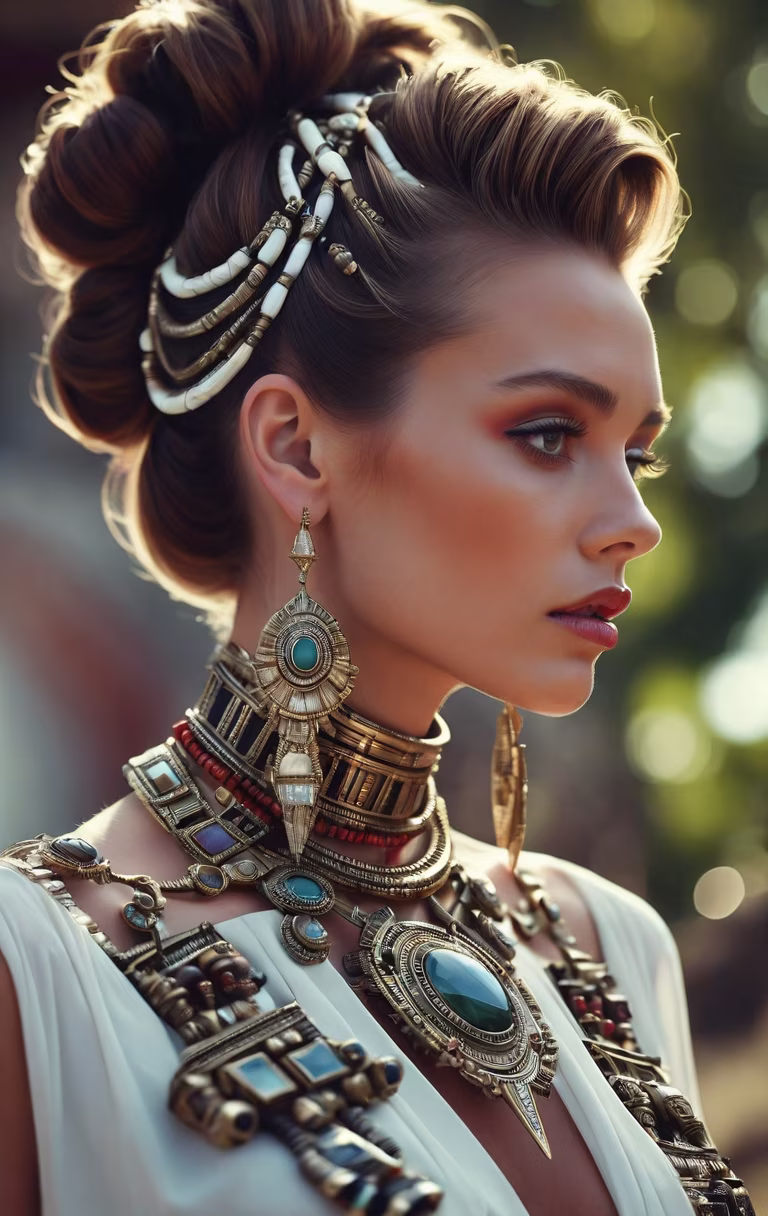 Prompt: Gorgeous model, zoom on her neck with intricate gemstone aztecs jewelry. Long updo Hairtyle, Very highly voluminous, very lofty, richly detailed, intricately textured. White shirt Alexander Mcqueen