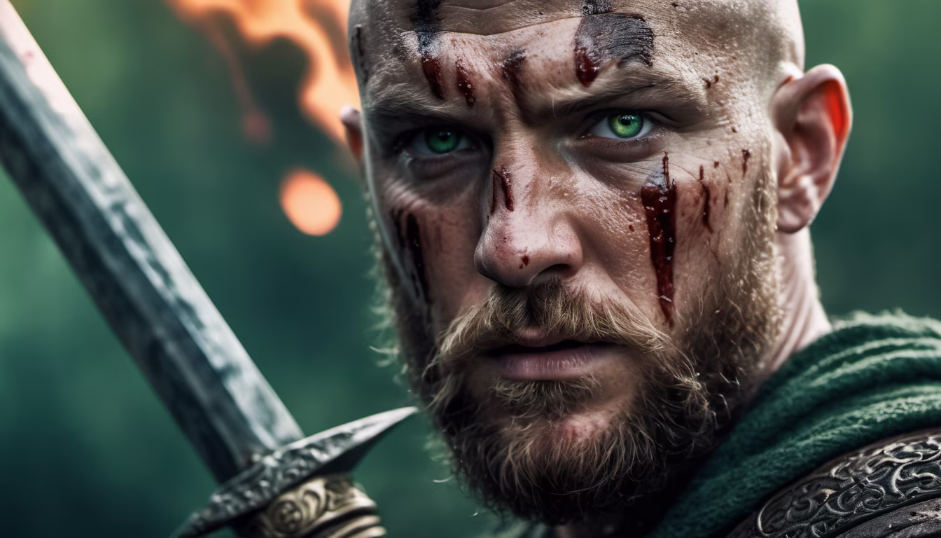Prompt: Cinematic close up shot of battle worn bald Viking Warrior, Sword with blood on held centered between his green eyes, background fire, bokeh, intricate details, cinematic shot, masterpiece