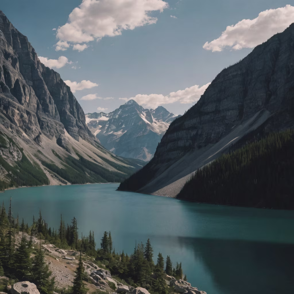 Prompt: a narrow lake in the middle of hills, blue skies, blue water, cinematic lighting, lake in focus