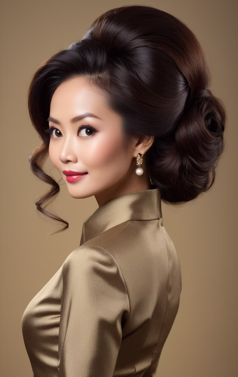 Prompt: Year:1972. High detail, Canon EOS DSLR photograph. UHD, 8K resolution, sharp focus, full color, medium shot, formal, in-studio portrait (high view:1.5) showcasing the extremely long hairstyle of a fashionable, age 35 Thai wife in 1972. She looks up at you, the viewer, in a friendly, playfully flirtatious manner. Her very extremely long, below her waist, thick, softly textured hair is expertly styled in a precisely arranged, full-bodied, alluring, sleek, lofty, voluminous bouffant updo with bangs. Solid color background. Accurate 1972 styling.