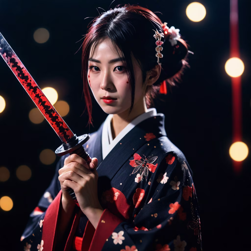 Prompt: woman japanese, holding a bug sword with blood, marks of blood in body, dark night, kimono, sparkling sword, light reflecting