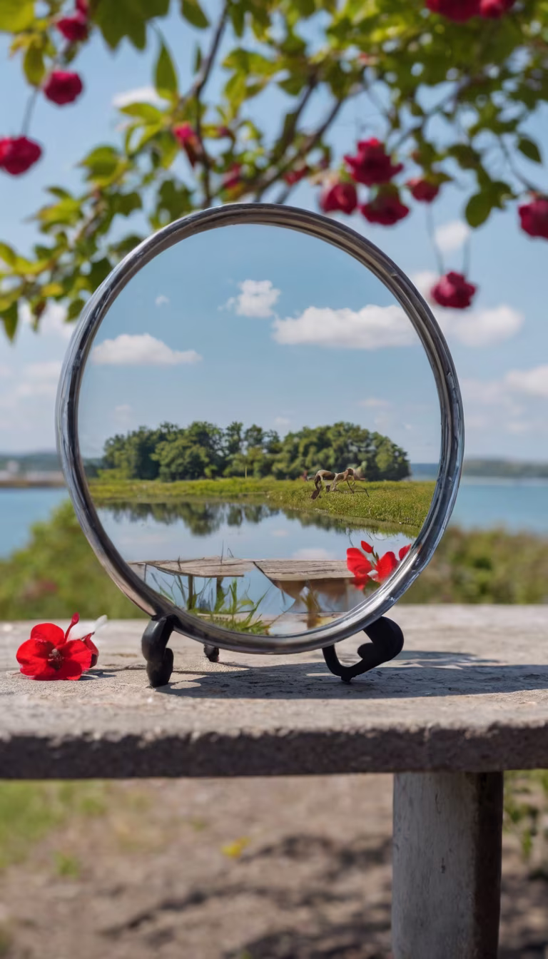 Prompt: There is an outdoor picnic table and a curved mirror. The mirror reflects an ant next to it and the blue sky, white clouds, green trees and red flowers. The picture has some distortion on the curved mirror. Next to it is a very small ant looking sideways into the mirror. The background of the picture is the blurred sea, and the lens is the reflection of the glass. The contrast is high, the colors are bright, the style is realistic, the details are clear, and the colors are vivid. , lifelike light and shadow, rich layers, and creative composition.
