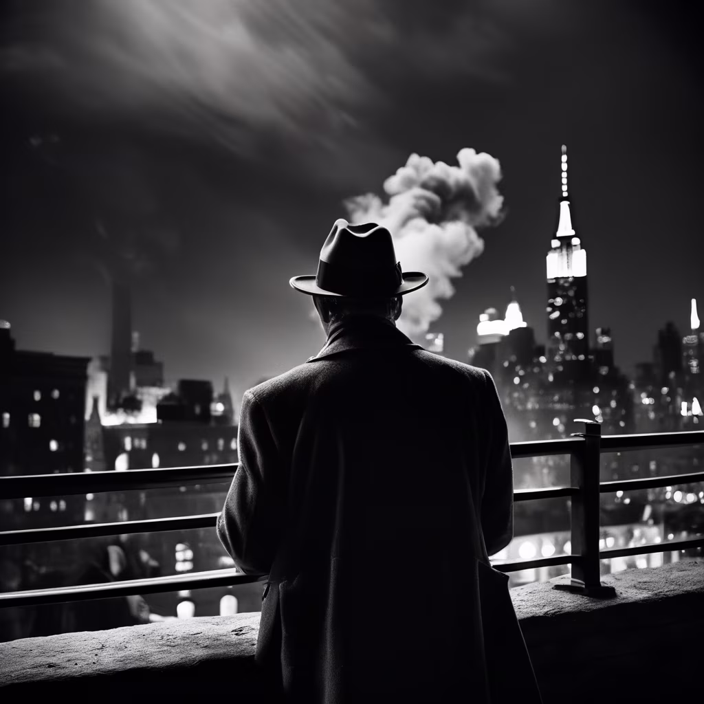 Prompt: a man staring at 1920's New York cityscape on a balcony, the man is wearing long coat, and hat, smoking a cigartette, viewed from behind, black and white noir style, film, movie