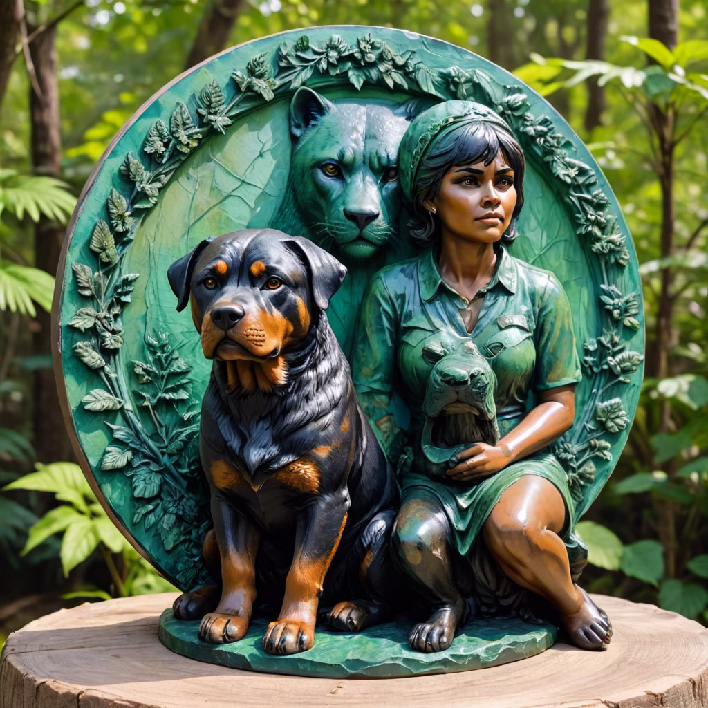 Prompt: round panel in the center of a panther and a Rottweiler sitting side by side, a woman with crossed arms and a man photographer at the back, text \"Luna the panthera\", forest hills, sculptural relief, realism, sculpture, detailed head, bright abstract style, epoxy resin