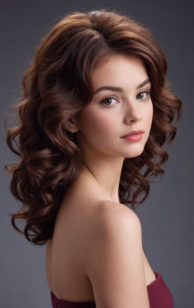 Prompt: Year:1962. Formal portrait. (high view: 1.5) High detail, Canon EOS DSLR photograph. UHD, 8K resolution, sharp focus, full color, extreme close up, college senior picture of an age 22 coed in 1962. Her hairstyle fills the viewframe. Her long, thick, full-bodied, richly textured, burnt mahogany hair is expertly styled in a precisely arranged, meticulously and uniformly shaped, soft, sleek, very highly voluminous, very lofty, very curly blunt-cut style. Solid color background. Accurate 1962 styling.
