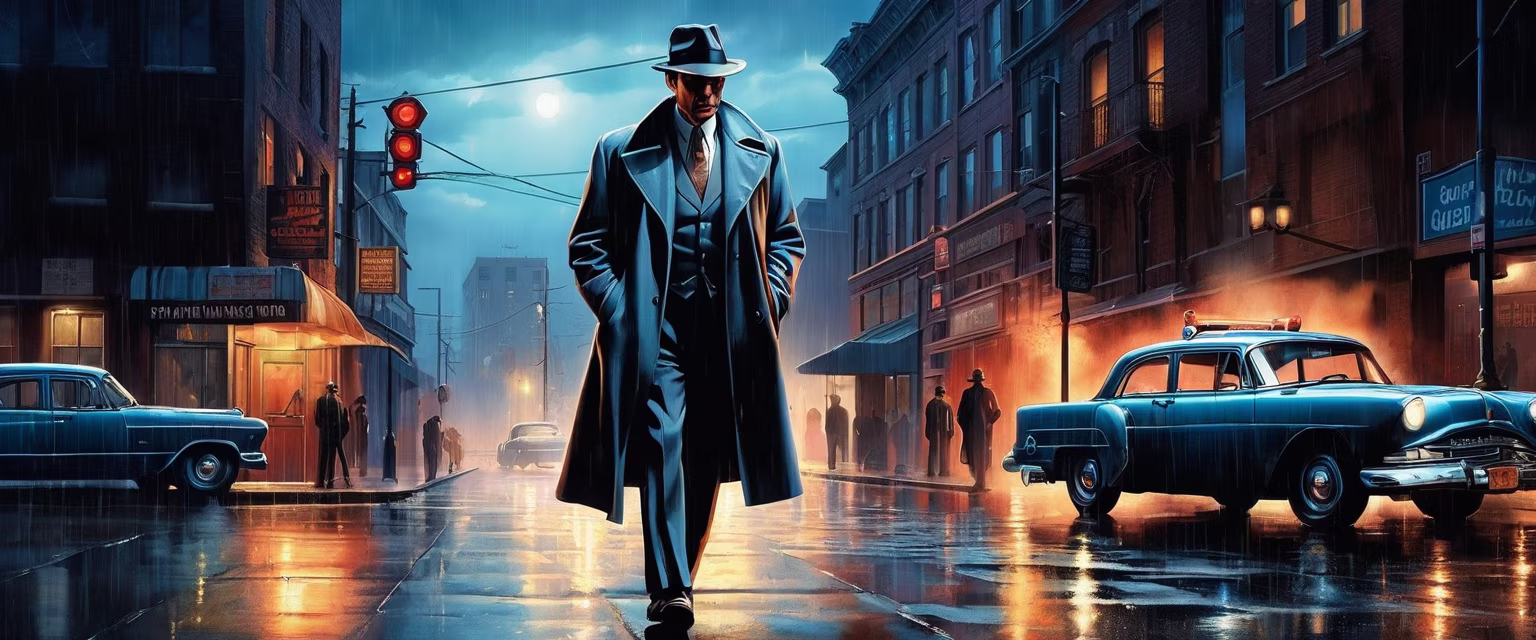 Prompt: detective art, full body, detective standing by scene crime, street, midnight, rain, clouds, lightning, retro crime poster, 50s, crime colors, 4k, ultra realism, high detail, dynamic movement, detailed facial features, artstation, best quality, illustration, intricate details, colored pencil drawing, by Frank Miller Boris Vallejo