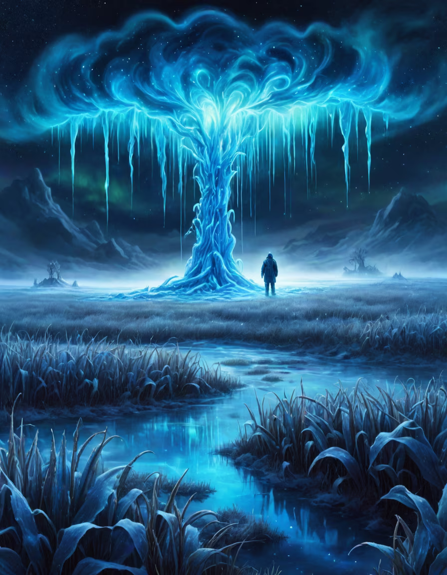 Prompt: extremely detailed quantum psychedelic complex dark blue bioluminescent giant massive ultimate Luminescent iced frosted cornfield with cold mist, rainbowed glowing fountains, view is extremely stellarful night with northern lights, water glowing fountains