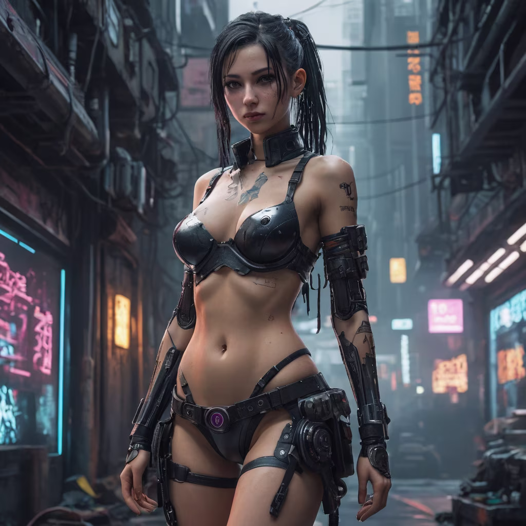 Prompt: Cyberpunk clothing is relatively fashionable, simple and uncomplicated. It uses less fabric and only wears a single top and shorts. jpg or png