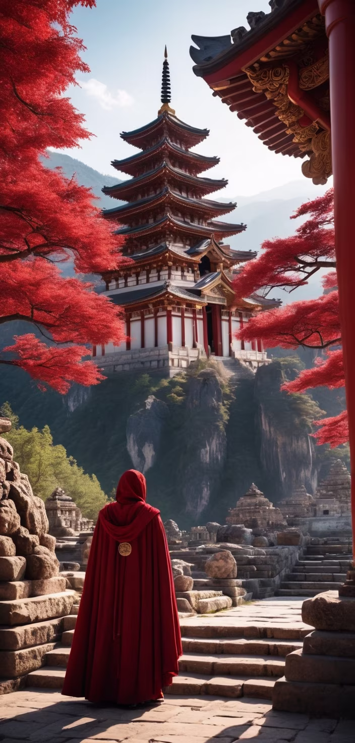 Prompt: An ancient temple at the top of mountain. A figure in a red cloak looks up