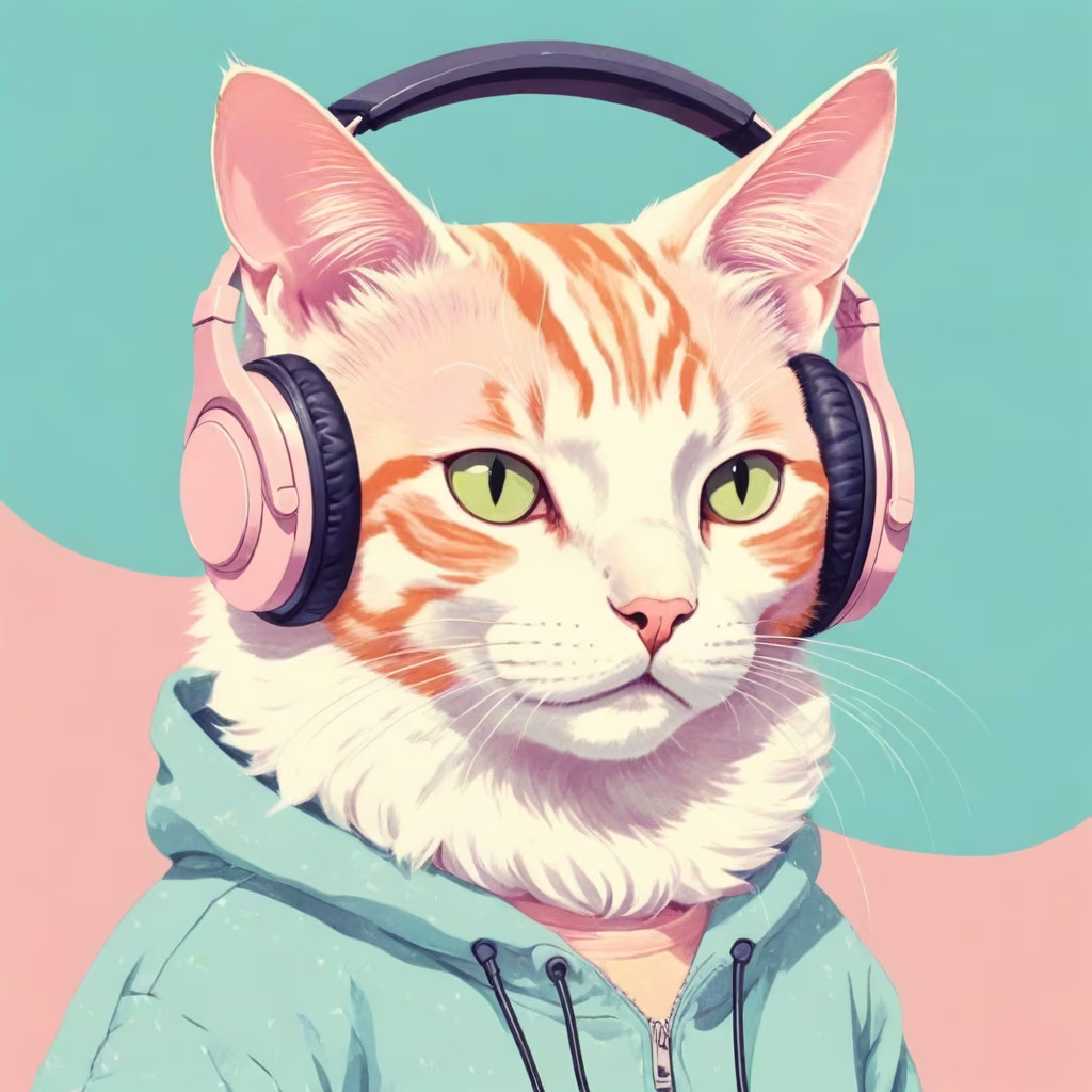 Prompt: an japanese vintage illustration with a cat, with headphones on. listening to music. directly watching the viewer. the illustration has pale, pastel colors. it has lofi music aesthetic. chill vibes
