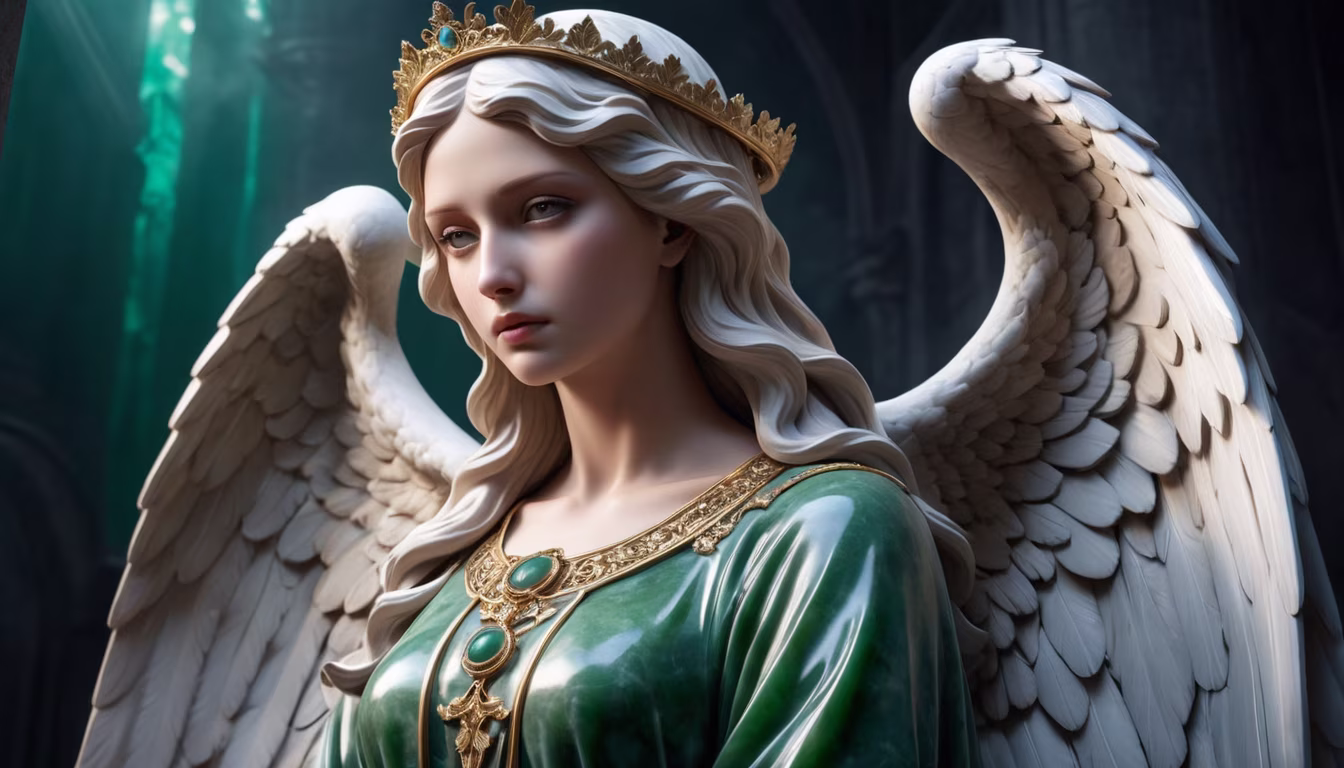 Prompt: highly detailed hyperrealistic sculpture of a sad angel woman made of marble and jade, eyes made of jade, very realistic, large wings made of marble with detailed elaboration of small details, the inscription on the photo \"Isa\", volumetric fog, hyperrealism, super realistic, unreal engine, over-detailed, cybernetic background, hyperrealism, cinematic lighting, highly detailed, the photo is permeated with horror and mysticism, so it's breathtaking, stunning surroundings, wide angle