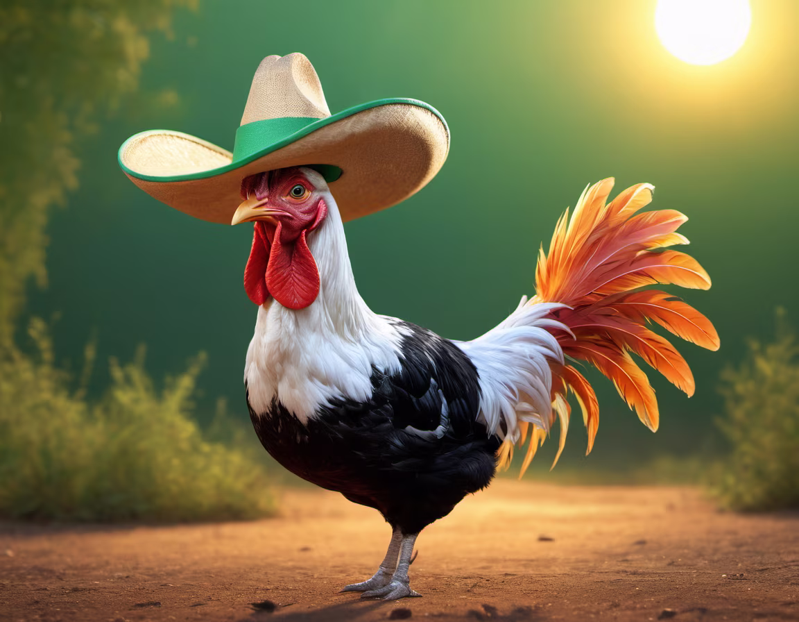 Prompt: Imagen fotográfica de un gallo con un pequeño sombrero de charro en la cabeza cantando alegremente al amanecer, los rayos de sol se cuelan entre las verdes hojas de los árboles.