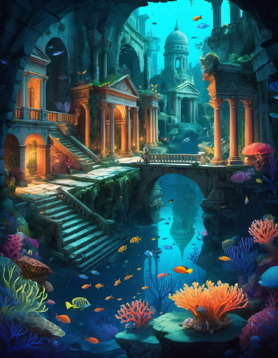 Prompt: a panorama of an ancient roman city blend in with grand royal gardens, look down, magnificent, fairy and dreamy, ((under deep sea)), (dim light), dark night, bioluminescent fish glowing, bioluminescent corals and floras glowing, whimsical and dreamy, vibrant colors
