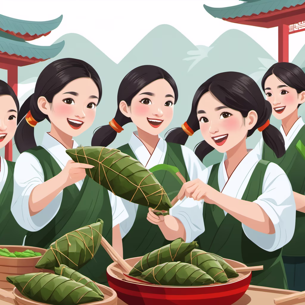 Prompt: Dragon Boat Festival; Traditional; An auspicious day; Very joyful; People are dancing; A collective gathering; Expressing the festive atmosphere through making zongzi;