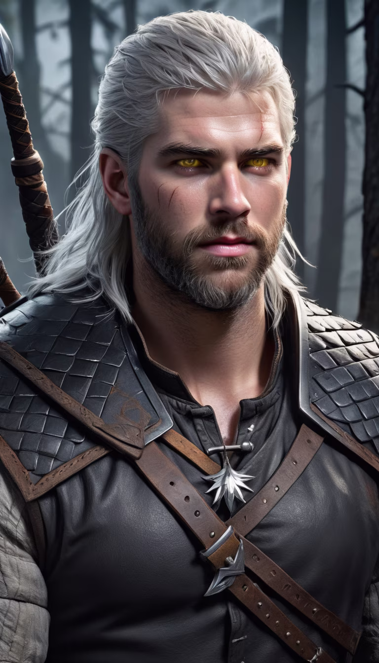 Prompt: \"Step into a world of fantasy and adventure with Liam Hemsworth as Geralt di Rivia. This diverse and unique rendering showcases the full body of the character, complete with a striking white beard and mesmerizing yellow eyes.\"