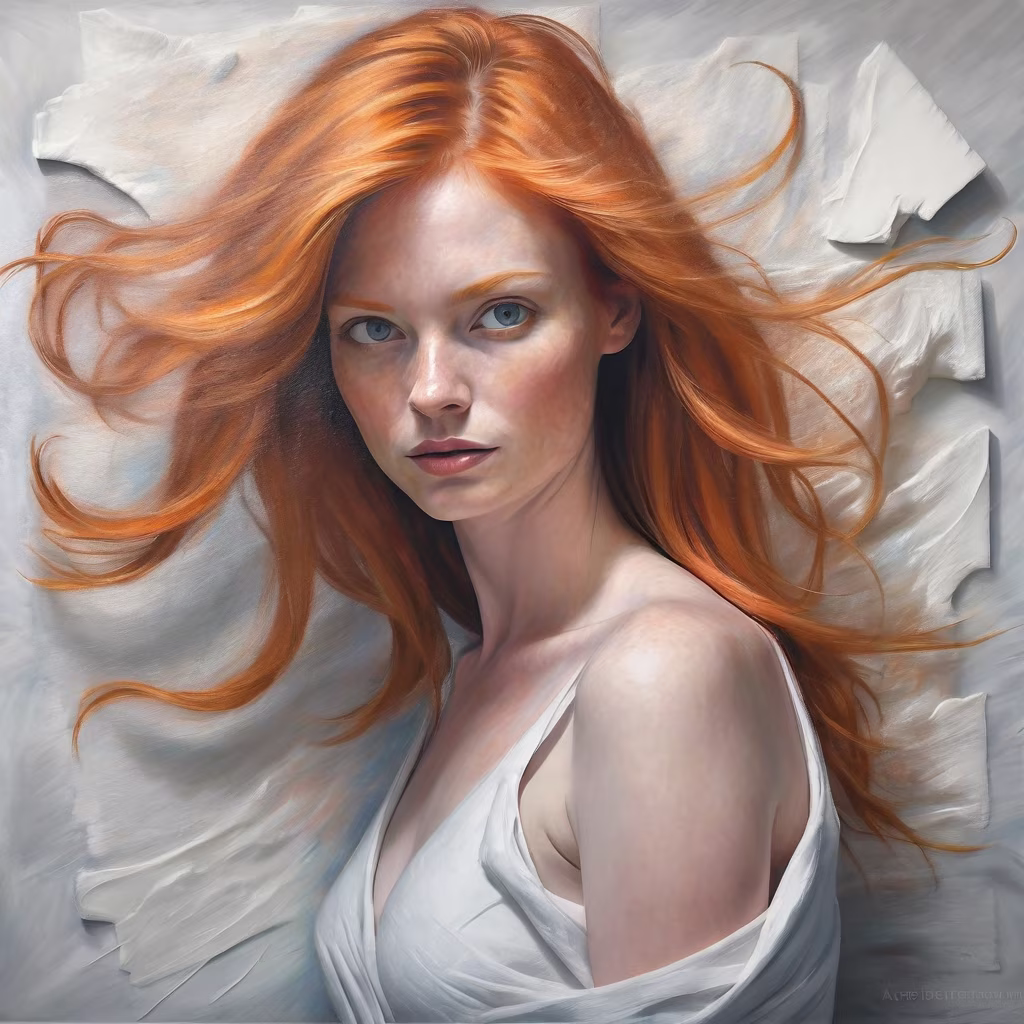 Prompt: A stunning ginger woman emerges from the white canvas, her dynamic pose captured in soft pastels and visible impressionistic strokes. The abstract background adds a touch of mystery to this incomplete painting.\"