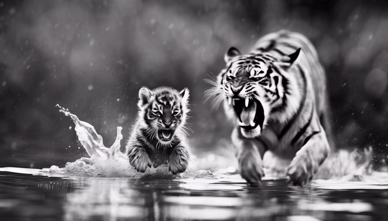 Prompt: realistic black and white photo, little duckling roaring at a big angry tiger