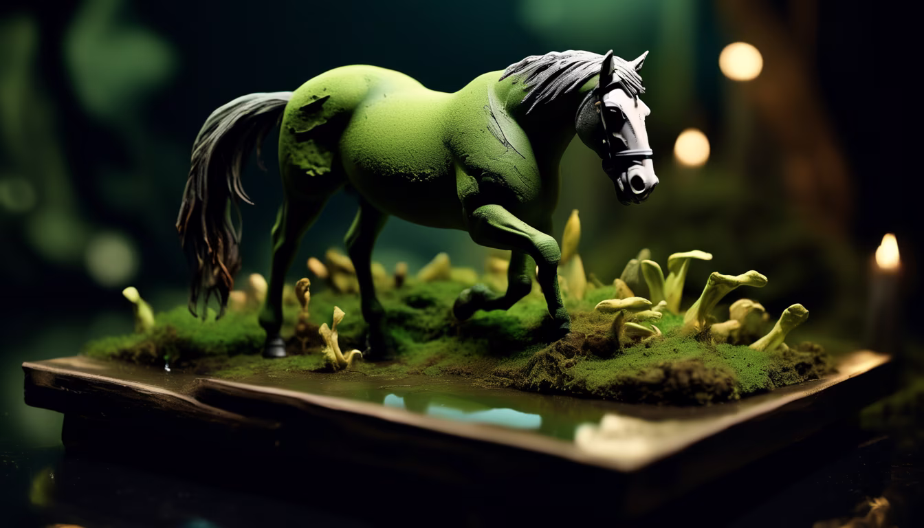 Prompt: extraordinary (diorama - model) scenery of the swamp where the horse Ártax, Atreyu's horse - from The Neverending Story - sinks forever into the Swamp of Sadness, model on a table, clouseup character, action, macro photography, plan side view from above, dynamic figure, soft smooth lighting, dark lighting, enimagtica, Skottie Young, 3D Blender render, polycount, modular constructivism, pop surrealism, physically based rendering, square image