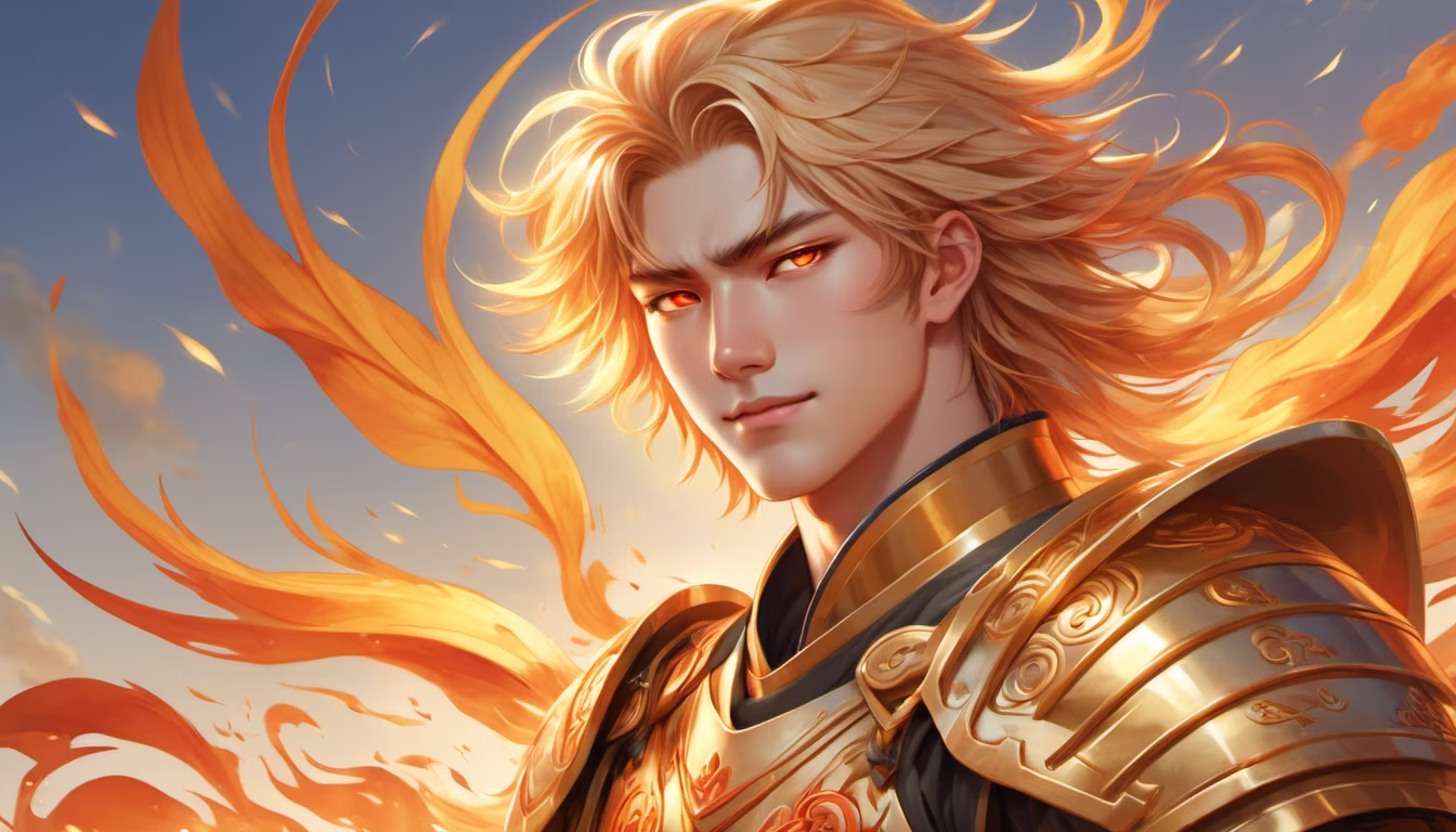 Prompt: An eighteen-year-old male warrior wearing golden battle armor. Long flowing golden hair, golden eyes, golden eyebrows, and golden eyelashes. Accompanied by a giant Chinese-style Suzaku with flames emanating from its body. Surrounded by lively flames. Standing on the clear prairie, there are ten suns in the sky. Feel confident and cheerful. The style should be cheerful and whimsical. Use bright sunlight to enhance the light atmosphere. Smiling eyes and handsome face show a childish side, but at the same time exude a heart-warming sexy charm. Natural elements are incorporated in a detailed and intricate way, displaying intricate patterns and textures of fire and sun. Vivid HDR 64K is extremely complex. Add depth, add texture. By artgerm, greg rutkowski, loish, and sakimichan.