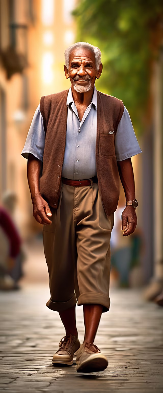 Prompt: An ultra-realistic painting inspired by elderly individuals, aged 70 to 80, Luzo-Brazilians, short stature, Negroid nose, and brown skin tone. They have round-square faces, happily empowered at a party, exuding a joyful atmosphere. They are dressed casually in short-sleeved shirts, pants, and sneakers. Full-body depiction with atmospheric lighting, ultra-detailed, photorealistic, in the style of photographic realism.