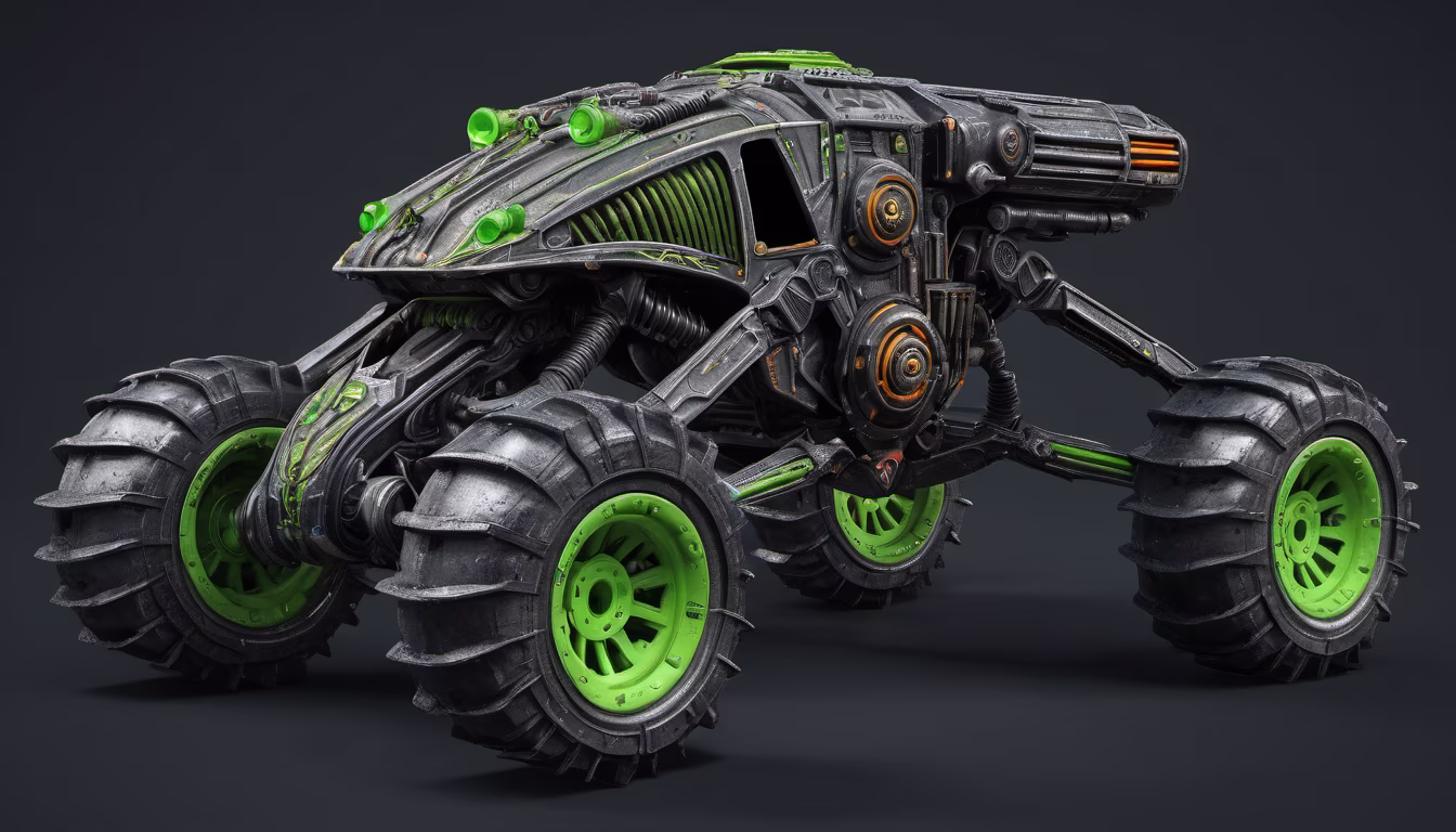 Prompt: necron style, game design, concept buggy as truck, powerful engine, huge wheels, strong protection, sci-fi, bizarre shape, wild power, warhammer 40000, colour, dnd, 3d, vibrant colours, high detail, high quality, octan render, by John Blanche, Diego Gisbert Llorens, Giger, Games Workshop style