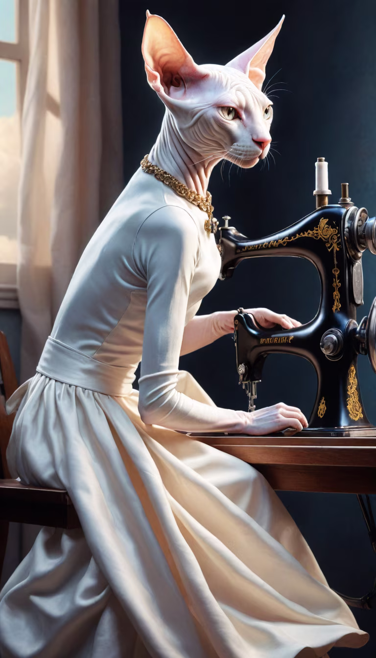 Prompt: a white Sphynx cat sits at a sewing machine and sews a dress, side view, hyperrealism