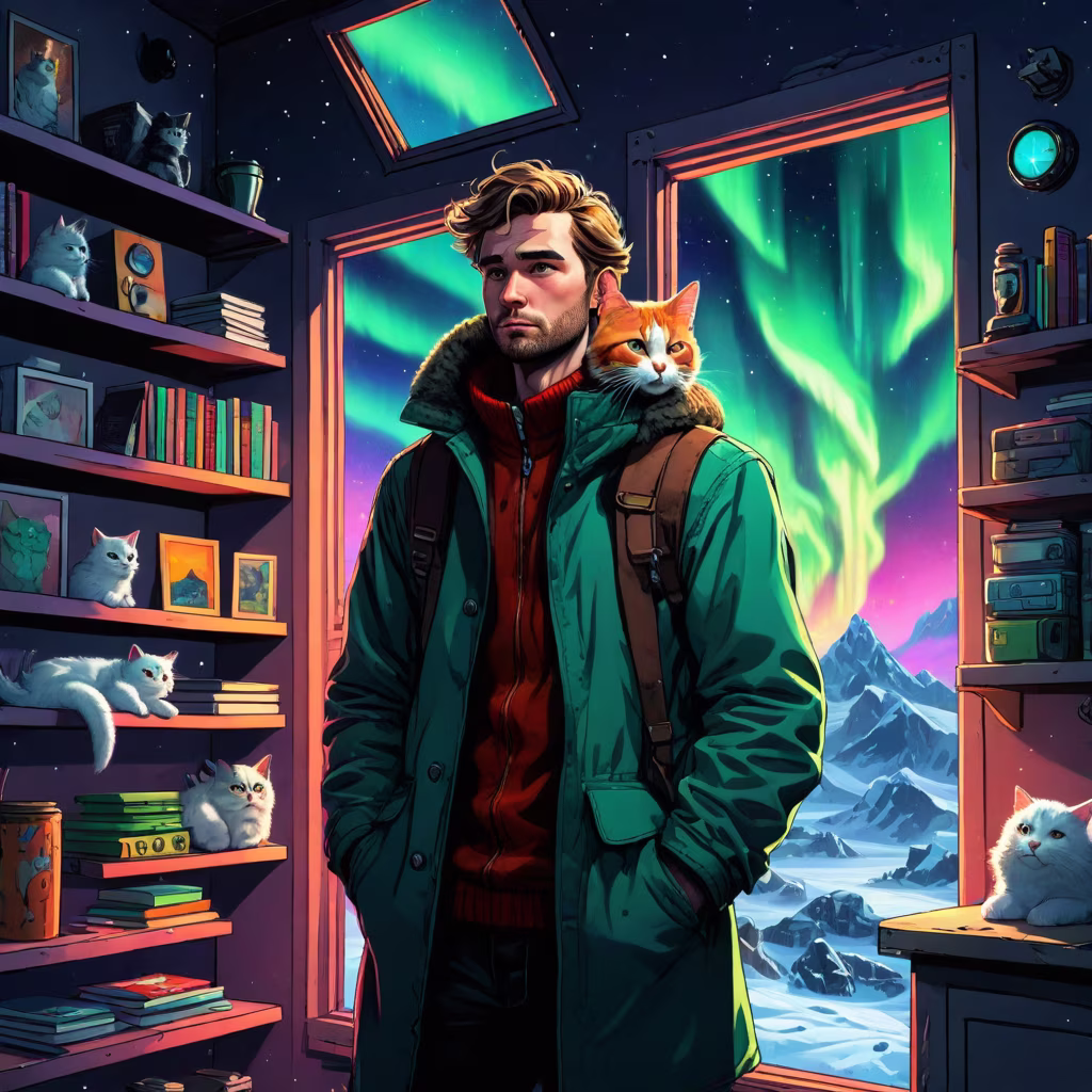 Prompt: A man with his cat on his shoulder envisions a happy day in the future when he visits the Northern Lights with his girlfriend. While the current scene with the man is dramatic and set in a black and lonely room, the envisioned scene is vibrant with colors. The man is daydreaming in a black and solitary room. There are Gears and blizzard andps,digital art,matte painting,awork landscape,concept art