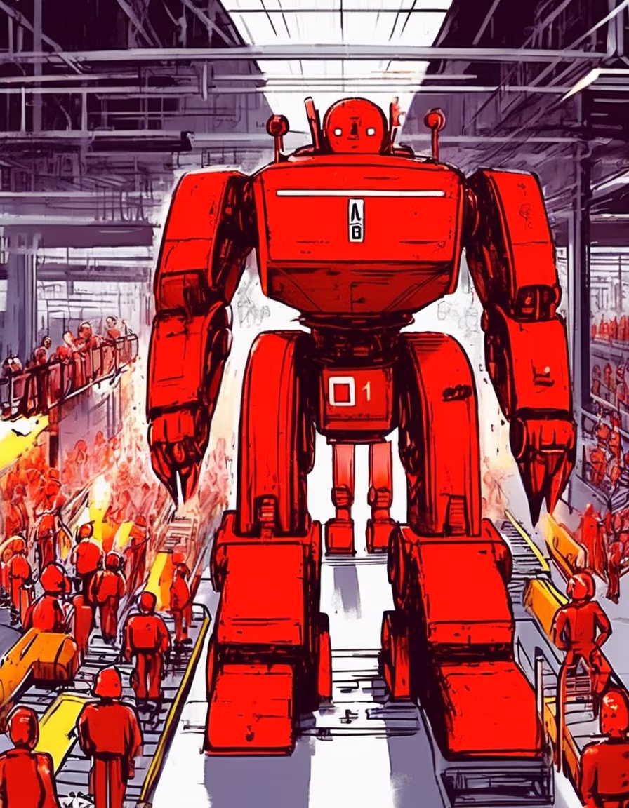 Prompt: painting of a giant red robot assembly line in a 1960s factory, art by Art Fitzpatrick and Van Kaufman