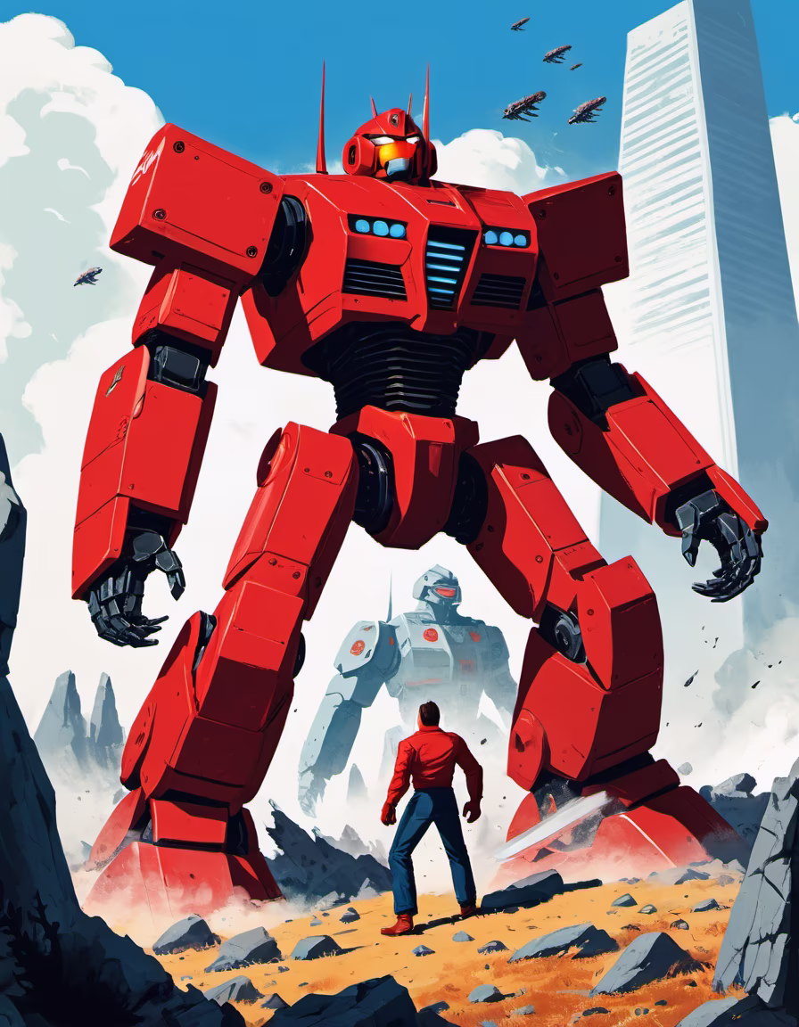Prompt: Beautiful pen and ink sketch of a giant red robot in a futuristic city, minimalist, colored