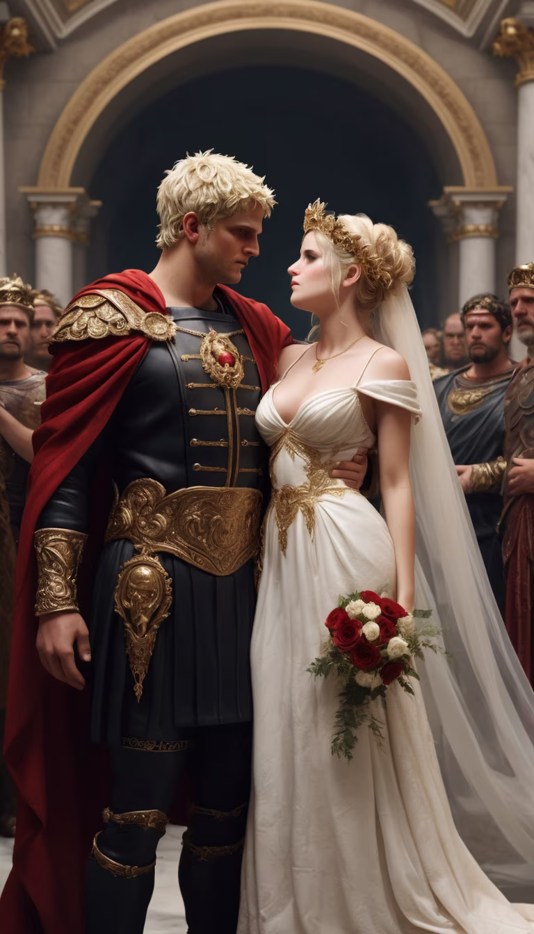 Prompt: Create an image of the lavish ceremony where Nero marries Sporus, emphasizing the opulence of the event and the forced nature of the union. Capture the conflicting emotions on Sporus' face during this twisted marriage.\"
