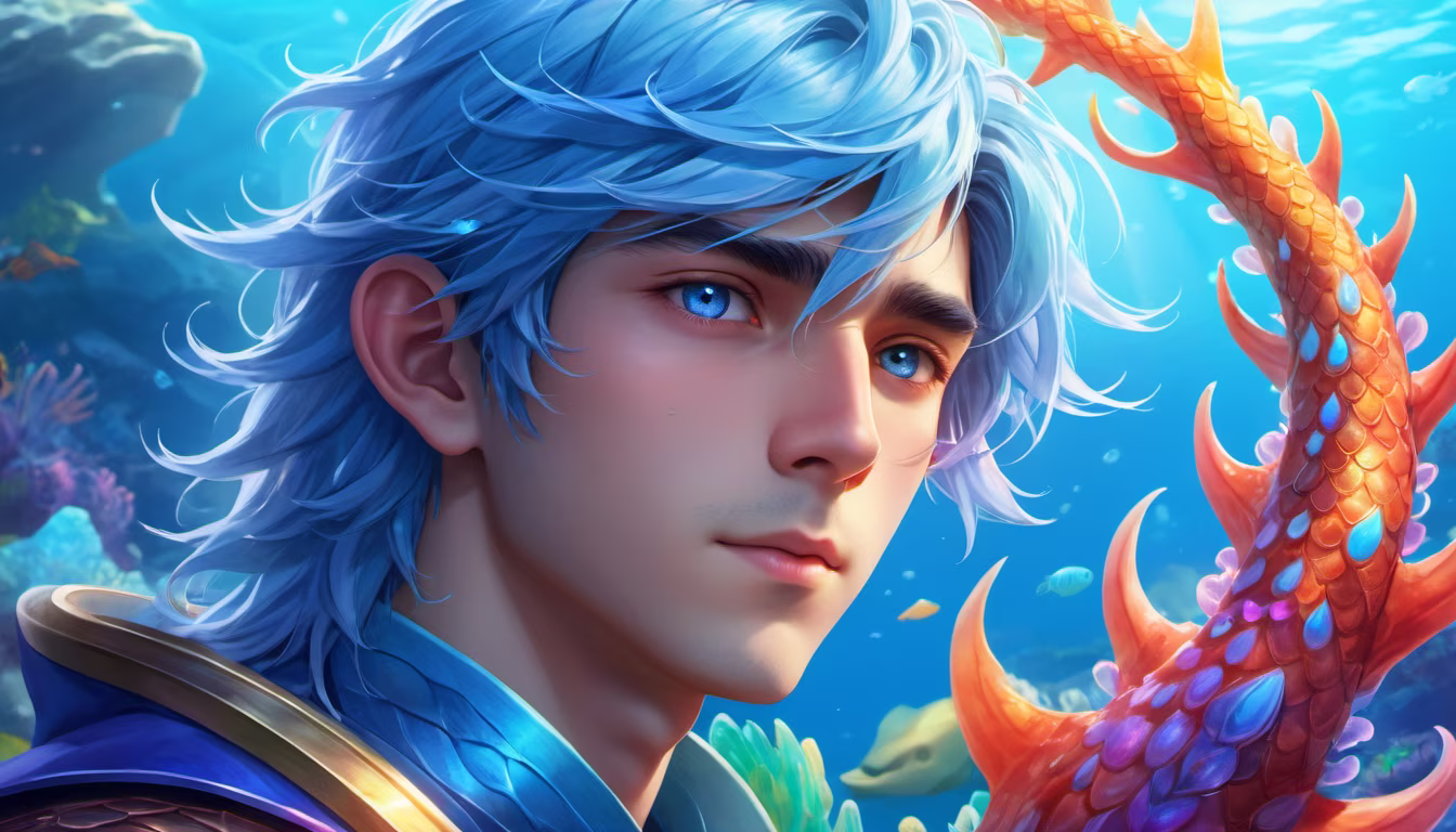 Prompt: A 16-year-old male, portrayed as a mythical deity, is depicted in a waist-up portrait against the backdrop of a colossal sea creature adorned with colorful scales. The setting features the enchanting beauty of underwater coral reefs. The male character boasts a sturdy chest, pale and smooth skin, flowing blue hair, blue irises, blue eyebrows, and blue eyelashes. His features include a delicate facial structure, 4K eye details, perfect facial symmetry, all accentuated with a 1.4x 4K high-detail rendering. The scene is enhanced with a 1.4x dynamic underwater light display (HD+), ensuring a high level of detail. The background is characterized by high detail and a meticulous environment, with elements like 1024K resolution, DHR (Deep High Resolution), double exposure, creating a masterpiece. The style is characterized by fantasy, and it includes elements such as self-portraits, rainbow lights, utilizing a 500px prototype, and embodying a Korean boy in a fantastical setting.