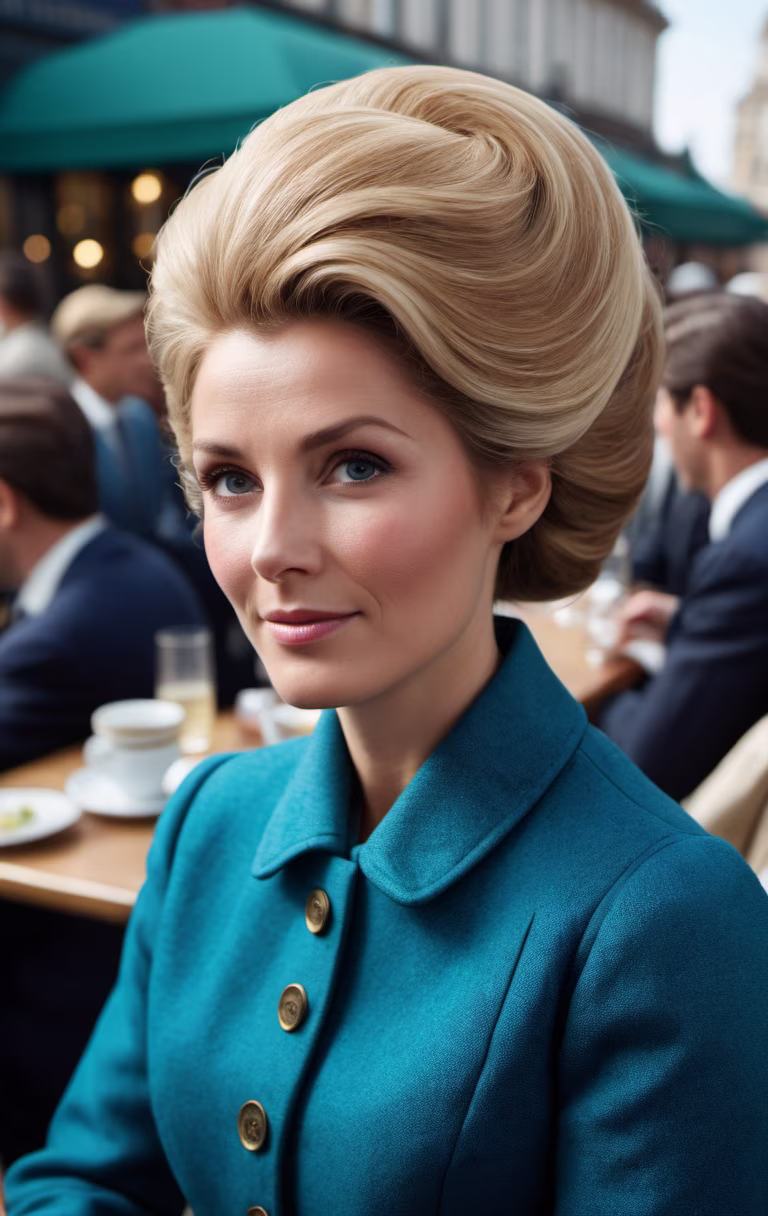 Prompt: Year:1966. High detail, Canon EOS DSLR photograph. UHD, 8K resolution, sharp focus, full color, close up, candid, intimate headshot portrait (from above:1.5) showcasing the blonde hairstyle of an age 45 socialite seated at a crowded, exclusive outdoor restaurant in 1966. She gazes up at you, the viewer, in a friendly, pleasant, yet expectant manner, confident of her status. Her long, thick, intricately textured hair is expertly styled in a precisely arranged, meticulously detailed, sleek, lofty, voluminous, smooth bouffant updo. She wears elegant, formal, feminine clothing. Accurate 1966 styling.