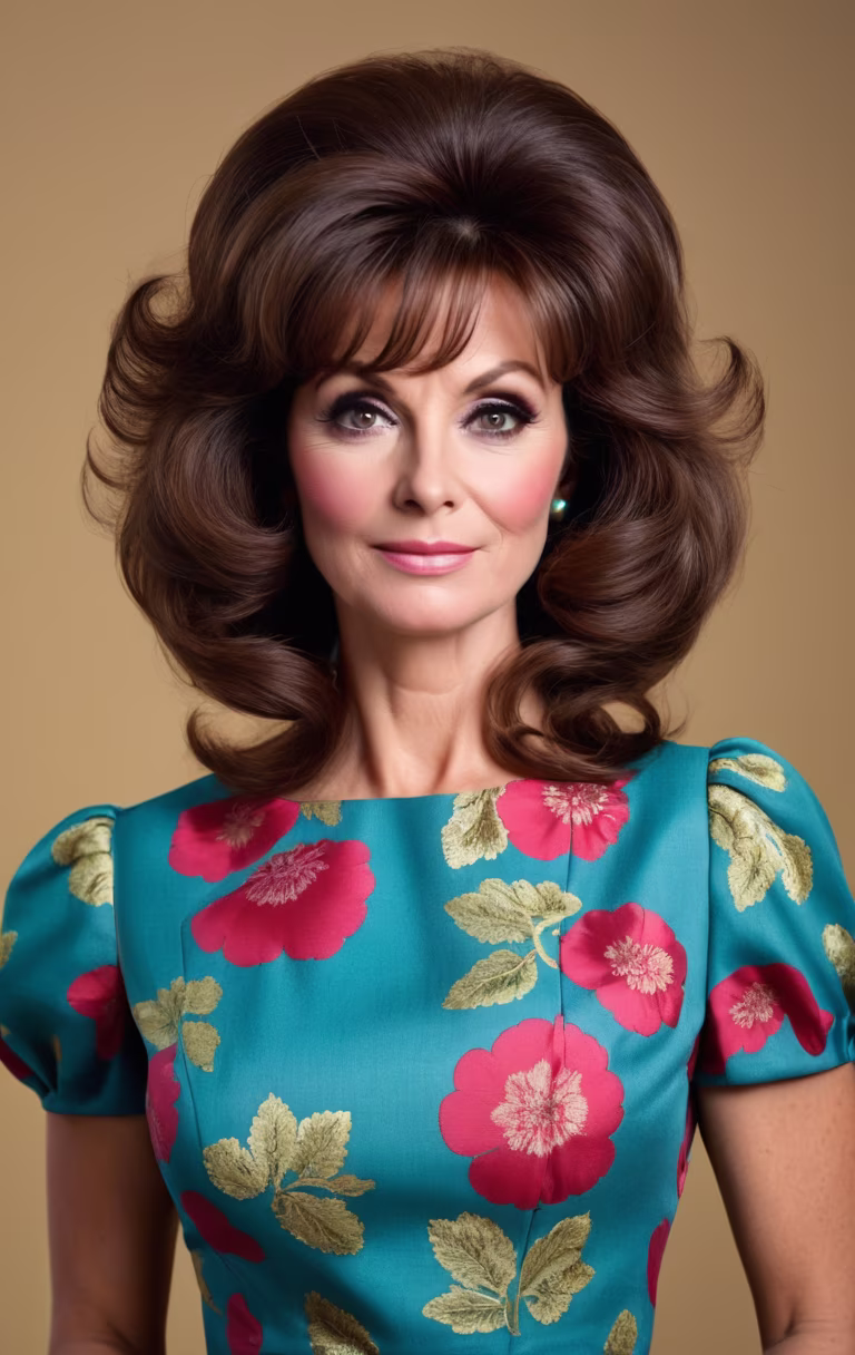 Prompt: Year:1967. Portrait (top down shot:1.1) High detail, Canon EOS DSLR photograph. UHD, 8K resolution, sharp focus, full color, formal, in-studio, close up headshot, showcasing the luscious, luxuriant hairstyle of an age 40, affluent, Jewish socialite from Manhattan in 1967. Her thick, richly textured hair is expertly styled in a precisely arranged, lofty, voluminous, full-bodied, wavy bouffant with thick luxuriant bangs. She wears a summer dress. Solid color background. Accurate 1967 clothing and styling.