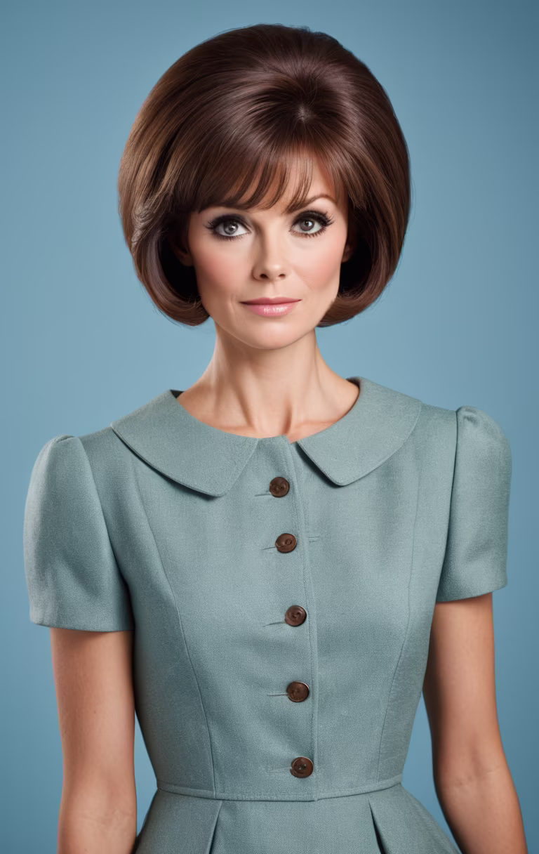 Prompt: Year:1967. High detail, Canon EOS DSLR photograph. UHD, 8K resolution, sharp focus, full color, close up, formal, in-studio headshot portrait (high angle:1.5) of an alluring, pleased, age 35 wife in 1967, gazing up into the camera. Her very straight, thick, luxuriant blonde hair is expertly styled in a precisely arranged, delicately combed, lofty, voluminous, very straight, sleek, smooth, long blunt-cut bouffant with long thick bangs. Bright lighting. Solid color background. She wears a casual blouse. Accurate 1967 styling.