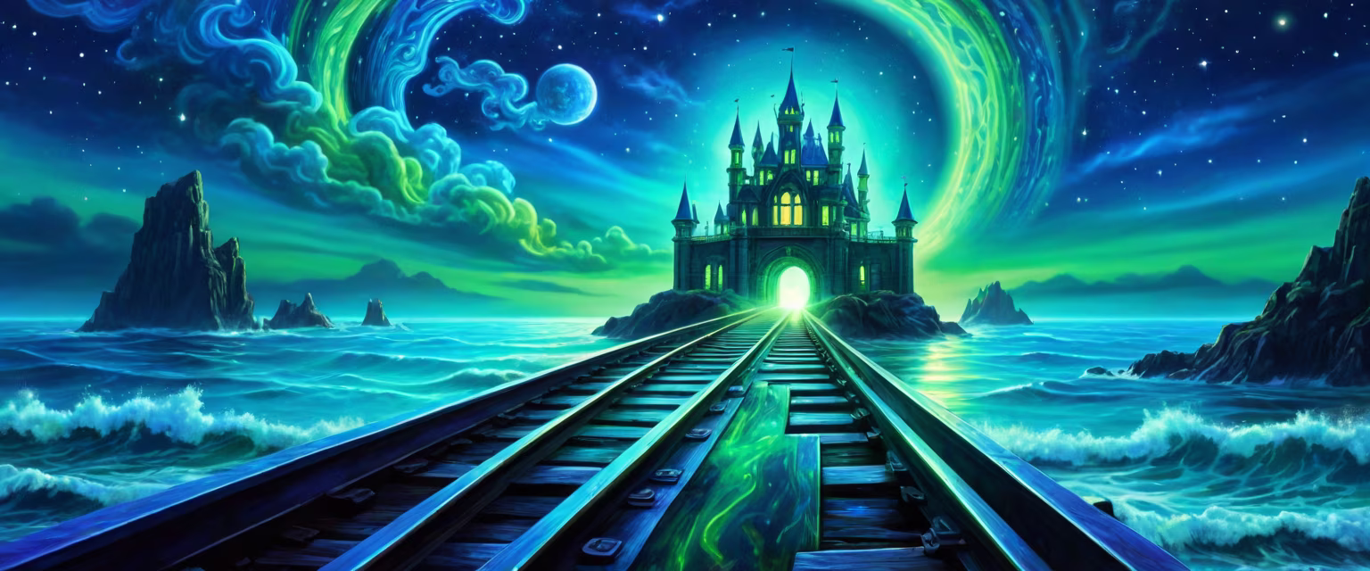 Prompt: ((Psychedelic luminous)) green and blue railways on ocean to the stars, sky castles, background is ocean waves at (((extremely night)))