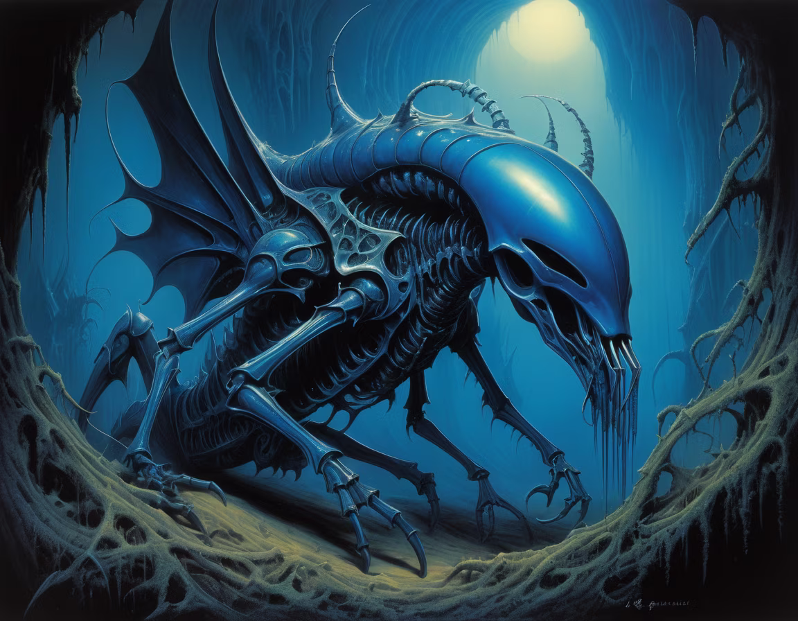Prompt: From vapors of the mesozoic, a cerulean mantis-soothsayer drifts amid brambled thicket. Her lapis armor etched with mantis hymns, psithurisms sloughing from fanged gape. Gleaming raptorial forelimbs etch runes into pliant viscera, funereal chimes encrypting sheol's yuggothian into entrails. Shrouded in cerulean cuticle, uncanny whispers flow from fractal form. (H.R. Giger, Zdzislaw Beksinski, Lee Hardcastle, Trevor Henderson, Camille Rose Garcia)