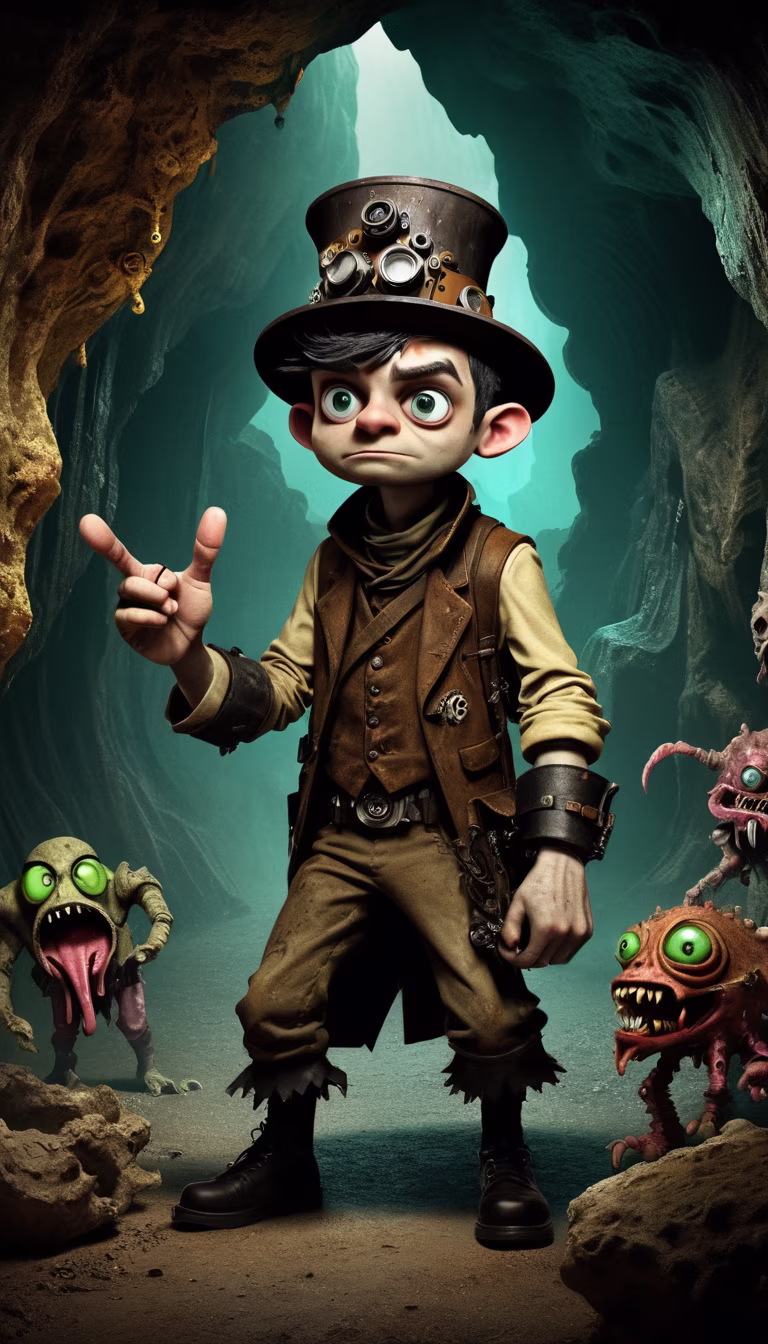 Prompt: movieposter movie \"YUCK\", person with facial expression of disgust wearing steampunkstyle attire, in a cave, the cave is dimly lit, there are strange weird creatures in the dark corners of the cave, poster text letters saying: \"yuck\",intricate textured background, black and color, movieposter style text \"yuck\" on top, disgusted steampunk explorer in a cave with creepie creatures( with text balloon \"yuck\" :1.2)