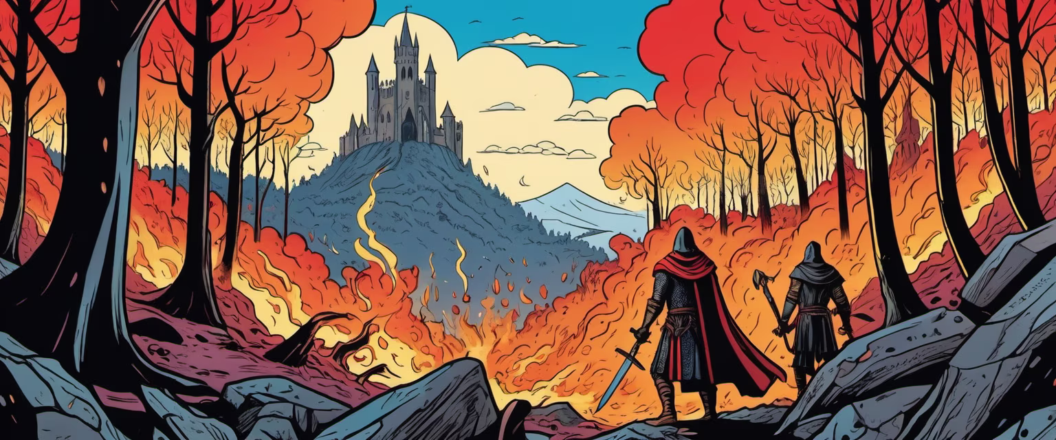 Prompt: panoramic view of medieval forest devastated by fire, panic pose, shout a cry, four medieval beggars flee among the trees and the ashes, Dante's inferno style, vivid colors, aura of destruction, tragedy, lineart style