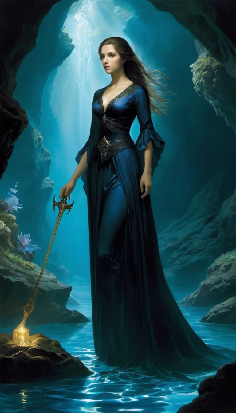 Prompt: In an enchanted underground river, a siren's melody flows through the caverns, her voice resonating with magical potency. Surrounded by bioluminescent flora and mystical crystals, she embodies the essence of dark fantasy. The artwork, influenced by John Howe, features dramatic split-lighting, casting long, haunting shadows. The surrounding underground world, a blend of Durand's and Aivazovsky's styles, adds a layer of mysterious allure.