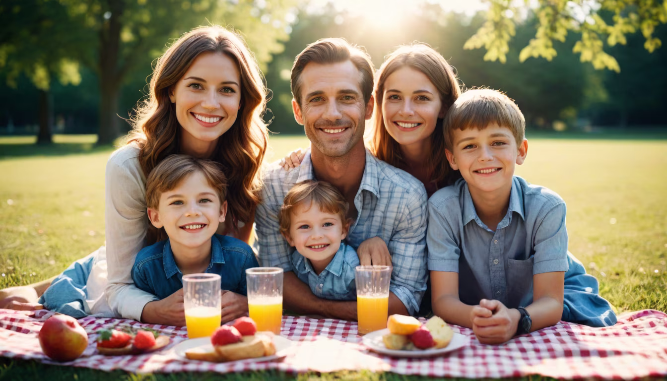 Prompt: family of four, picnic, smiling into camera, water bubbles, sunflare, beautiful memory