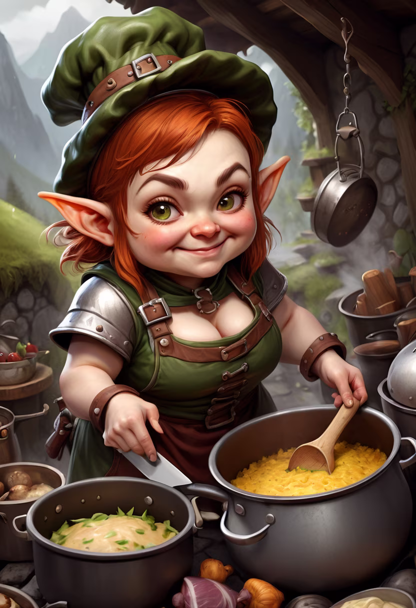 Prompt: Warhammer fantasy, little Halfling woman, chubby, pretty, happy, cook, hat on head, cooking pot, in nature