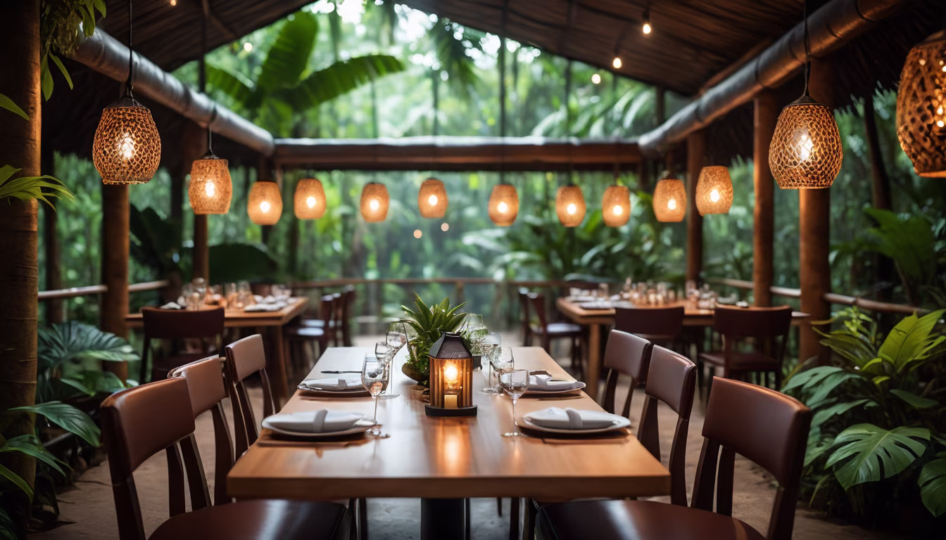 Prompt: Interior Design of a luxury Punjabi Restuarant, Earthy Tones, Bright Natural Lighting, Sleek Lines, Bohemian, Detailed, Eco Freindly Architecture, Plants, Wall Lights