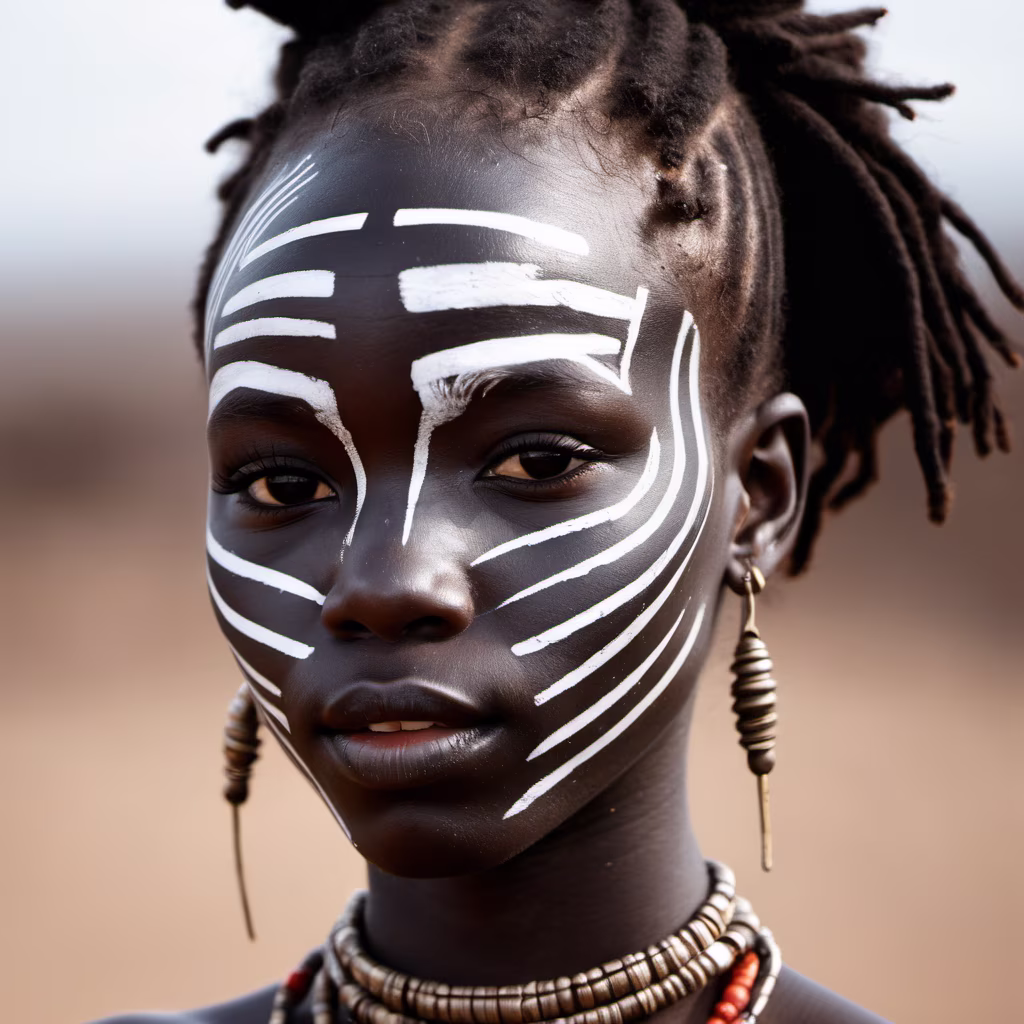 Prompt: a african girl, tribal face tattos with white ink intricate detailed symmtrical , netgeo photography , 4k hi res detailed