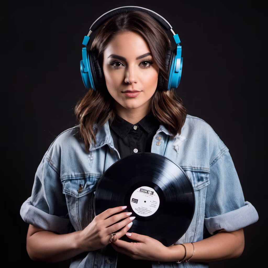 Prompt: this sexy female dj in her 20's has headphones on and is holding several vinyl records in her hands, center view, dark background.