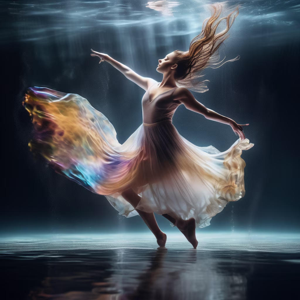 Prompt: A female humanoid figure in the pose of tap dancing. Her toes are gently touching upon the water's surface, with crystal clear and liquid limbs and molten movements. The composition is infused with melted melodies and amorphous elegance, exhibiting water beauty. Translucent transitions, dissolved dancers, and an aquatic aura.